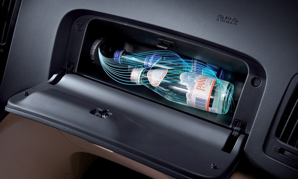 A consola entre os dois bancos da frente vem com um porta-copos retráctil capaz de armazenar um par de copos ou garrafas.
