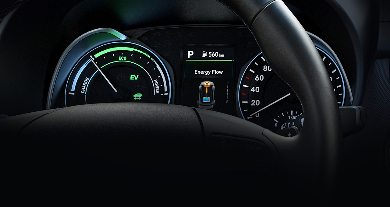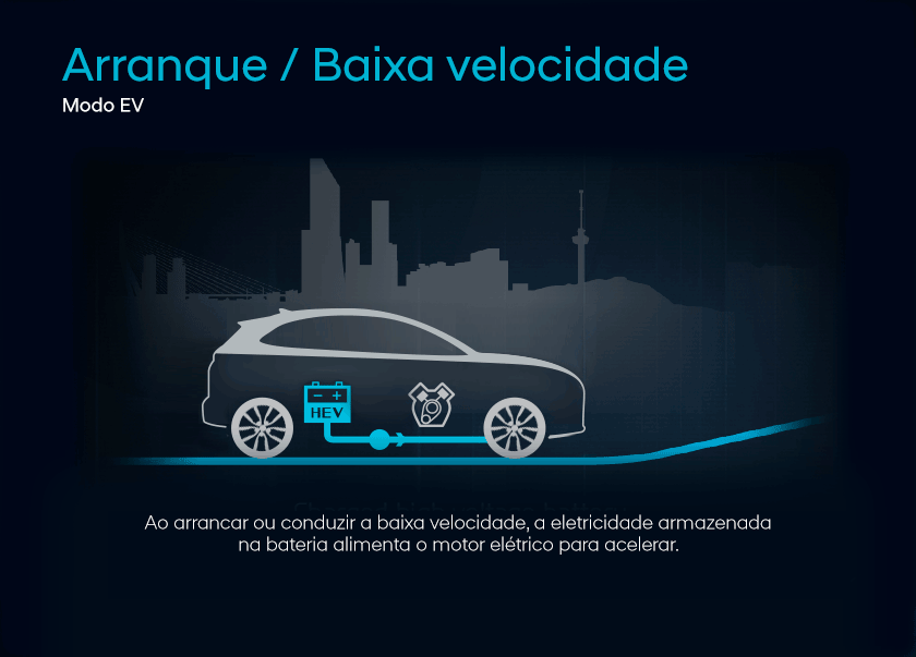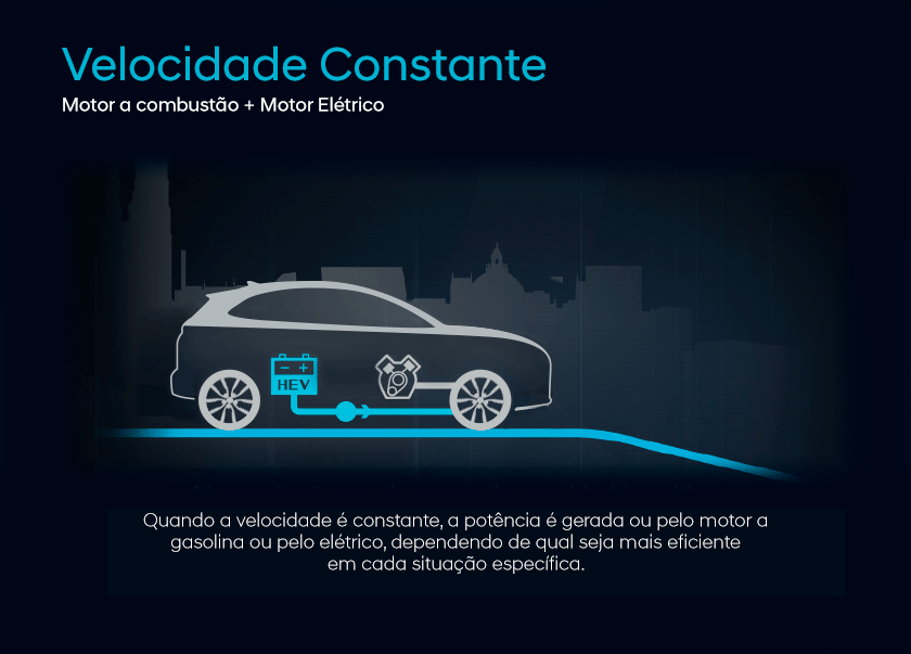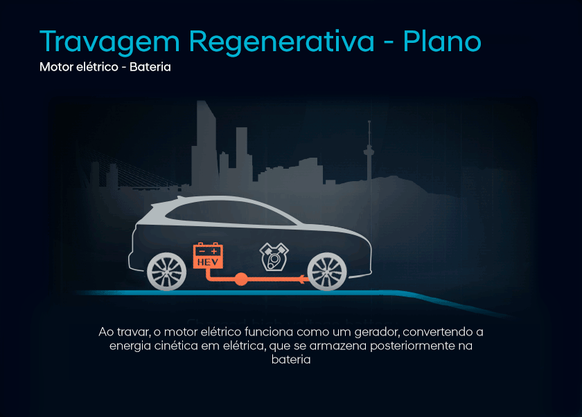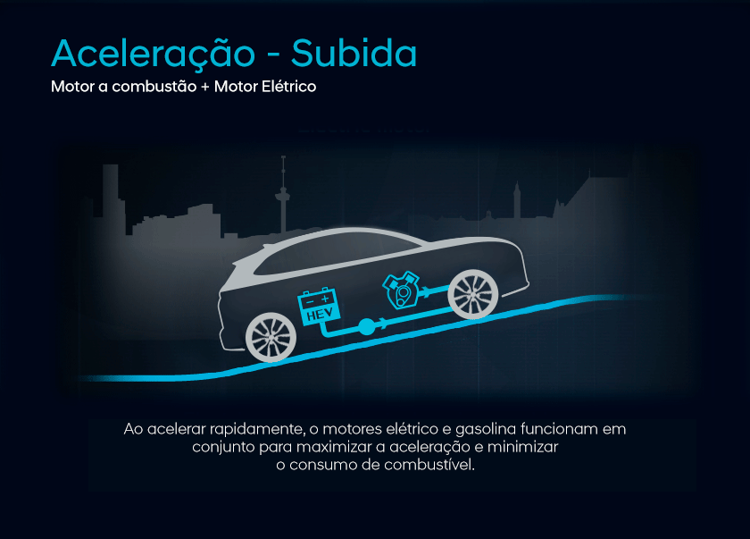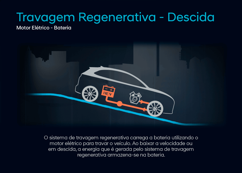 Consoante da situação de condução, o novo KAUAI Hybrid muda impercetivelmente entre motor a gasolina e motor elétrico. O sistema de travagem regenerativa recarrega a bateria usando o motor elétrico para abrandar o veículo. Depois, a energia armazenada na bateria alimenta o motor elétrico para ajudar nas acelerações nas subidas e nas descidas. Este fluxo de energia complexo é ilustrado nas animações a seguir.