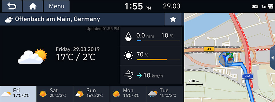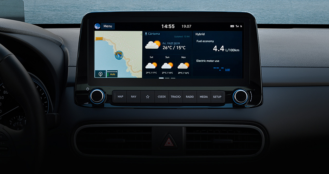 O novo KAUAI Hybrid está equipado com tudo o que precisa para tornar a condução menos cansativa e chegar mais rapidamente ao destino. O sistema de navegação áudio-vídeo (AVN) com ecrã de 10,25 polegadas inclui uma assinatura gratuita de cinco anos dos Serviços LIVE da Hyundai. Com estes serviços pode aceder a informações em tempo real sobre locais e preços de postos de combustível, informações de trânsito, previsão do tempo e POIs para o sistema de navegação e ainda lugares de estacionamento interior e exterior e concessionários Hyundai – e até mesmo alertas de radares de velocidade sempre que permitido por lei.