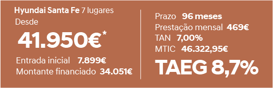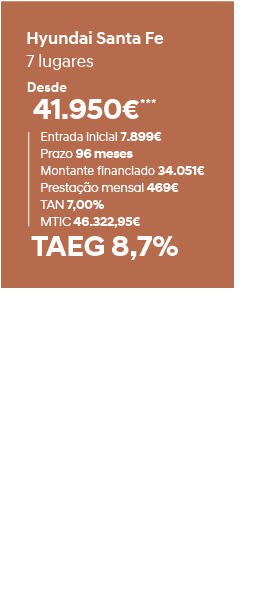 * Exemplo para um contrato de Locação Financeira a utilizar no financiamento automóvel com um PVP de 47.401€, 1º renda de 18.744,50€, mais 47 rendas no montante de 290€, incluindo a Comissão de Processamento de Prestação de 3,75€. Comissão de Abertura de Contrato de 375€, TAN 3,0%, TAEG 3,7%, última renda 18.012,38€ e MTIC de 50.761,88€. Ao PVP acresce o IUC. O valor da renda não inclui seguro de crédito facultativo, não estando refletido no MTIC e na TAEG. O exemplo de financiamento é válido para veículos novos durante a campanha válida para contratos até 30 de setembro de 2019, para o Hyundai Santa Fe versão Executive, limitada ao stock existente e disponível nos concessionários aderentes. Informe-se no Cetelem, marca do Banco BNP Paribas PF. Todos os concessionários são intermediários de Crédito a título acessório e atuam sem carácter de exclusividade. A imagem pode não corresponder ao modelo em campanha. Valor não inclui pintura metalizada. Consumo combinado (l/100km): 6,5-6,7. Emissões de CO2 em ciclo combinado (g/km): 170-177. A garantia de 5 anos sem limite de quilómetros da Hyundai é apenas aplicável aos veículos vendidos por um concessionário autorizado da rede Oficial Hyundai a um consumidor final, de acordo com os "Termos e Condições no Livro de Garantia".